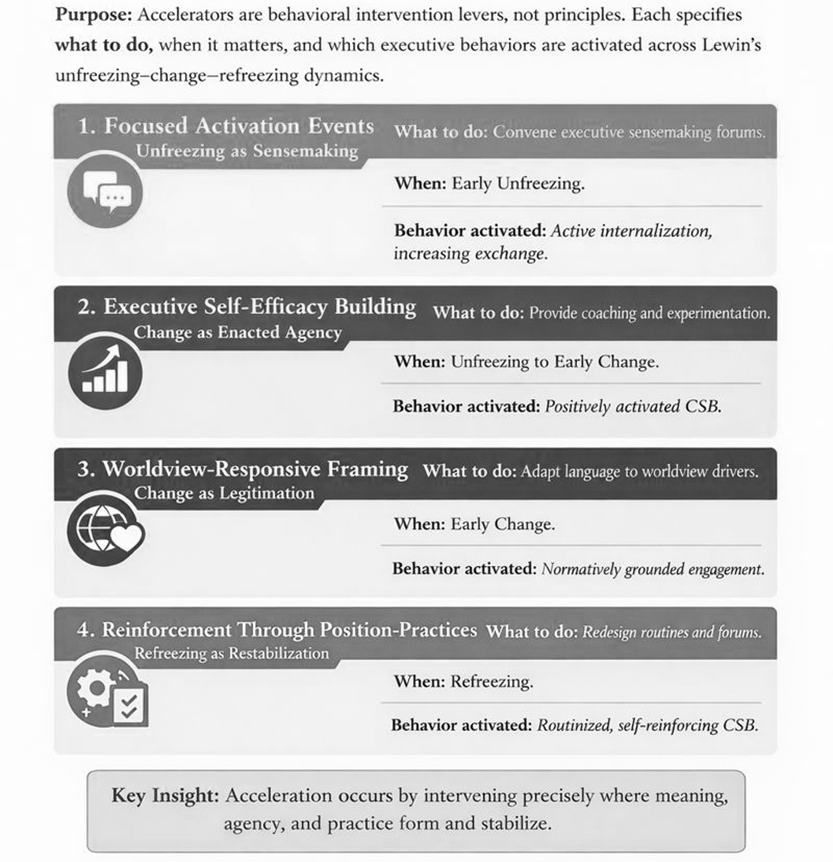 To make things practical, culturally agile change agents can apply four accelerators to traditional change models (such as Lewin’s Three Stages) to support success: